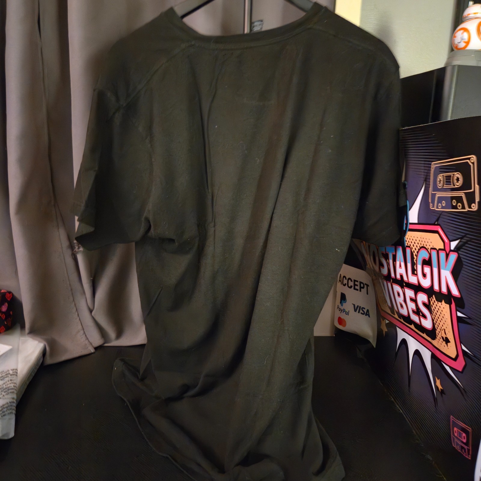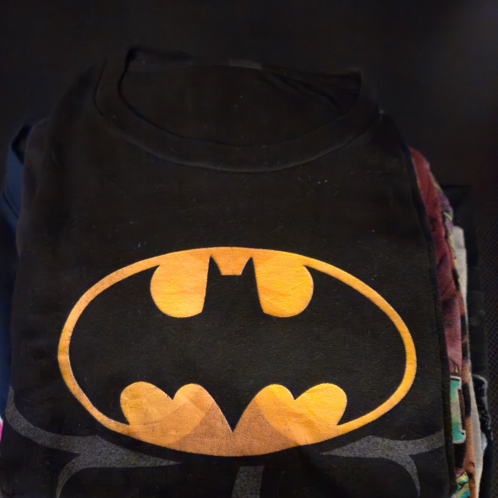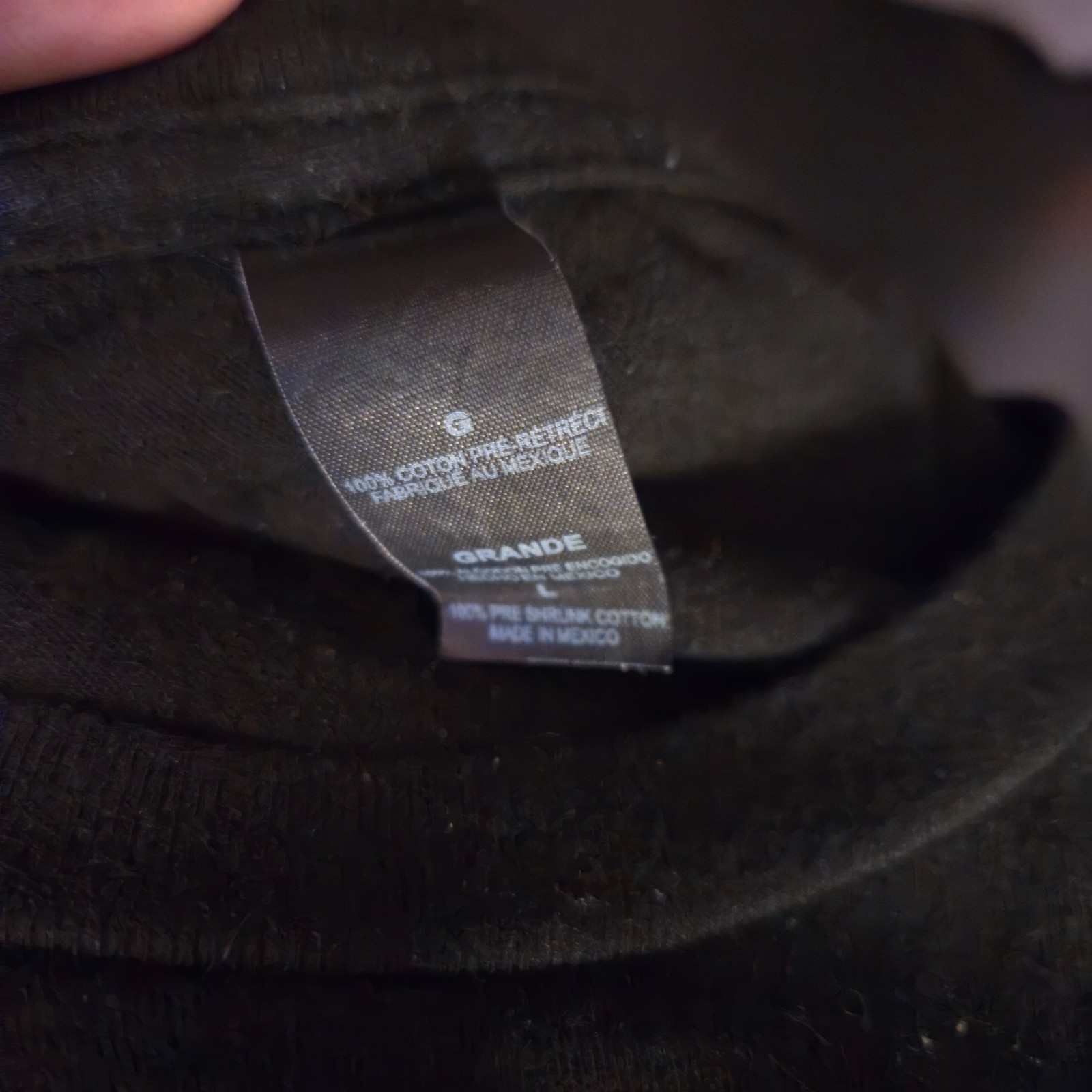 Preowned. Shirt shows normal wear from previous use (minor lint and light fading consistent with a used black tee). No major stains, rips, or holes noted. Please see all photos for exact condition.Great casual tee for comic fans, Halloween costume use, or everyday wear.
