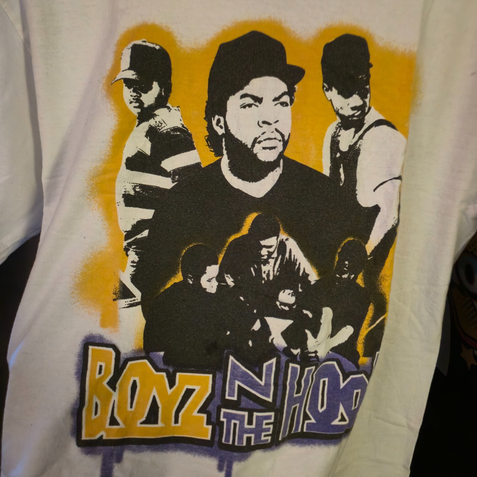 Bold front graphic print with vibrant yellow and purple accents featuring Ice Cube and scenes from the movie. Perfect for fans of classic hip-hop culture, 90s films, and streetwear style.