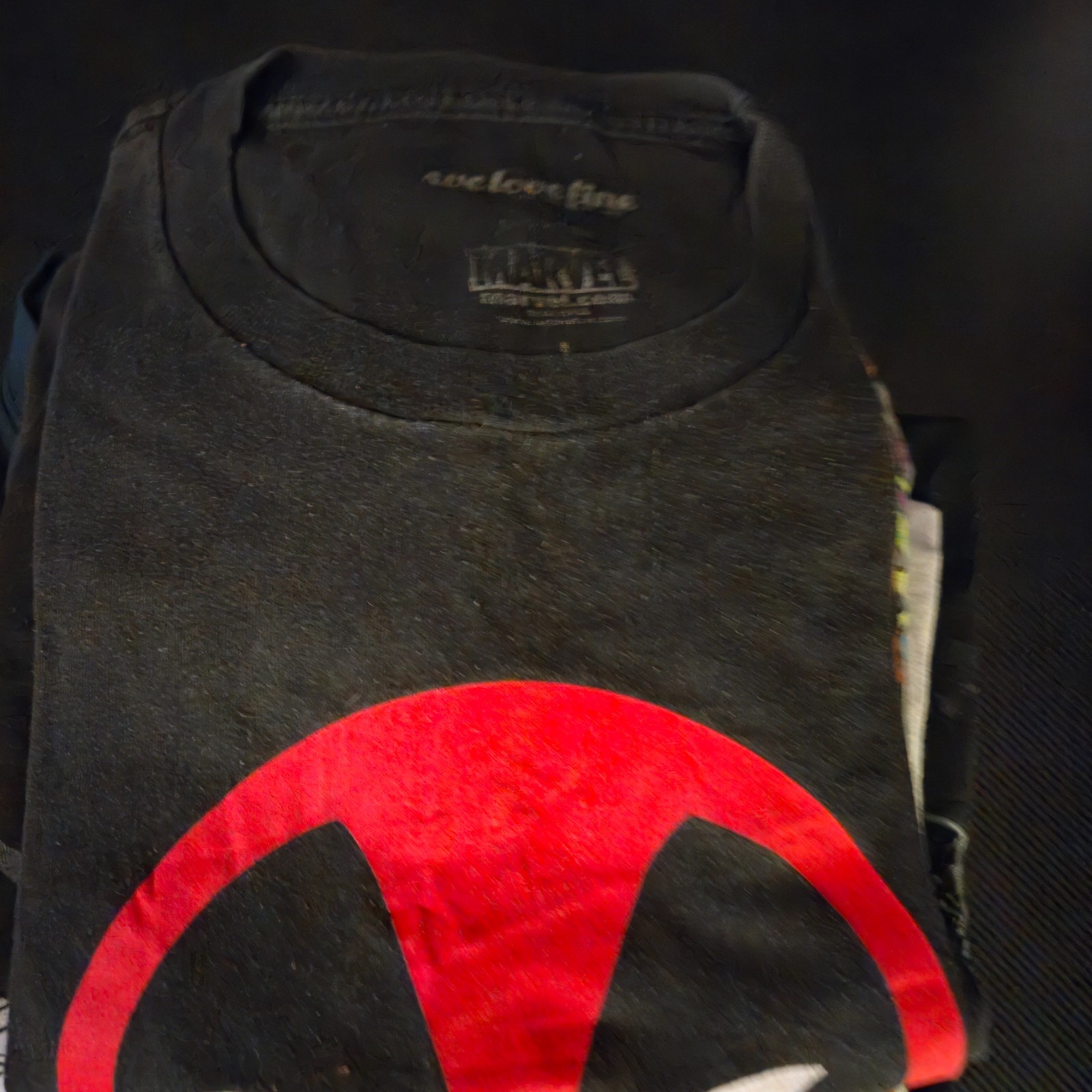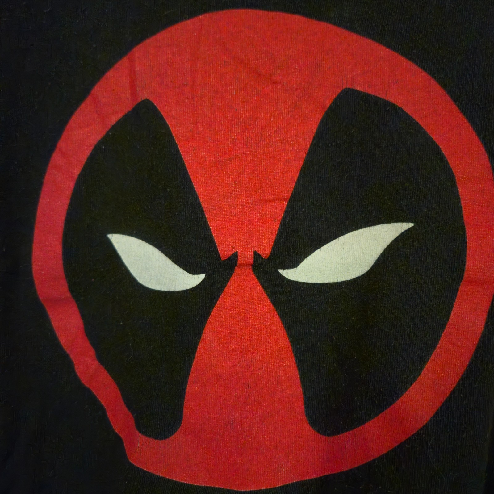 Classic red Deadpool logo design printed on a black short-sleeve tee.Size: Large