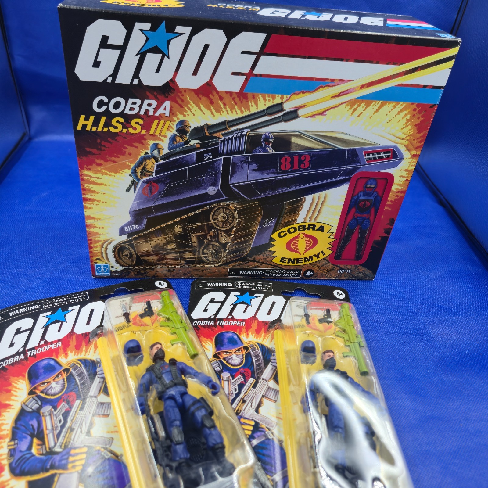 Modern issue G.I. Joe Cobra H.I.S.S. III Tank with Rip It driver figure, plus two carded Cobra Trooper figures.