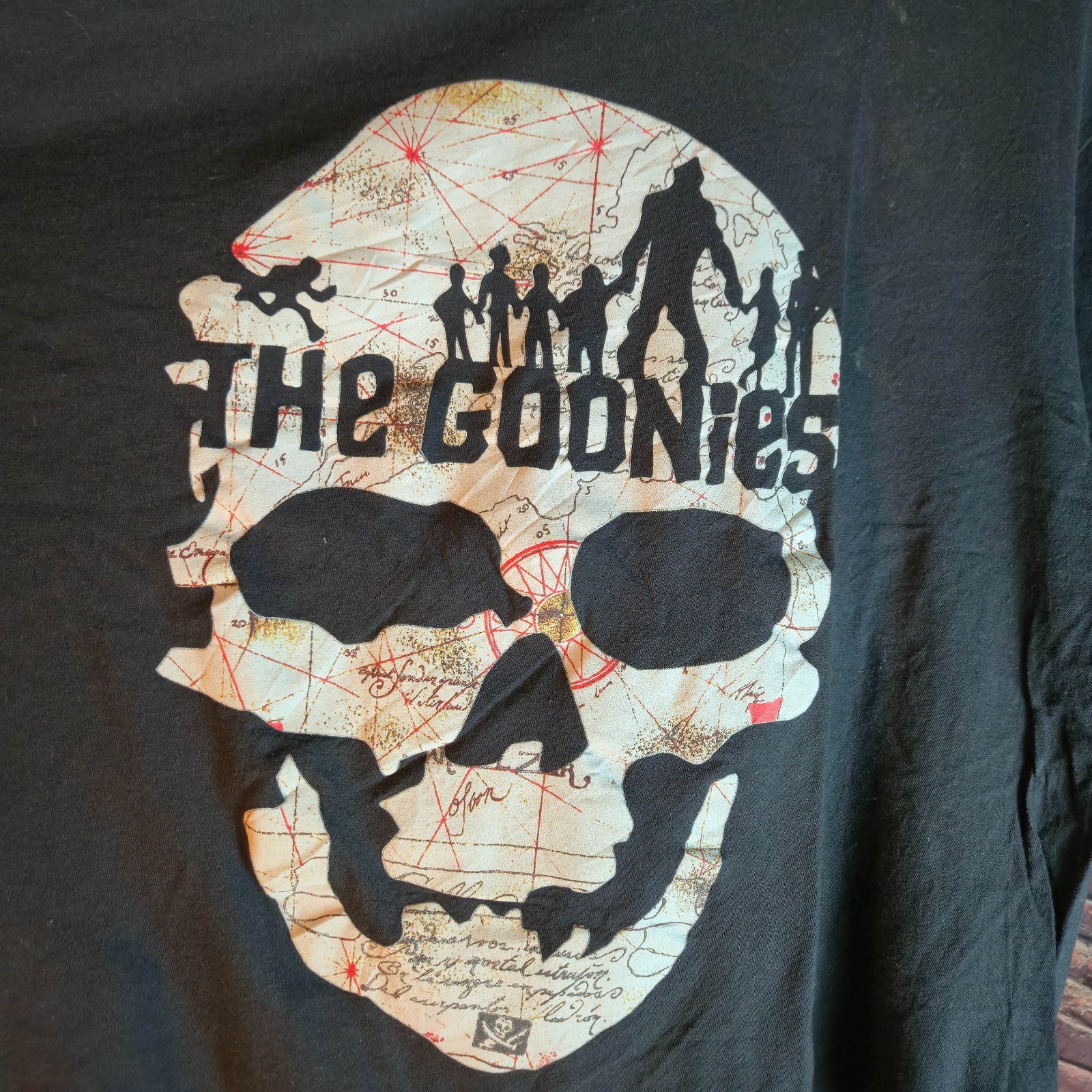 Classic The Goonies graphic T-shirt featuring an awesome skull treasure map design with silhouettes of the iconic adventure crew across the top. A must-have for fans of the legendary 80s film!