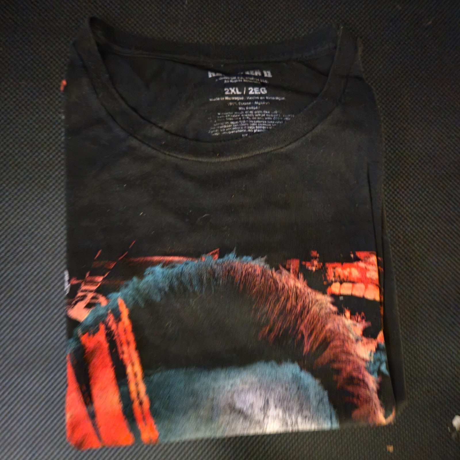 Pre-owned, good overall condition with normal wear from use. No major rips or holes. Graphics remain vibrant. Please see photos for exact condition and measurements.Perfect for horror fans, Halloween collectors, or everyday casual wear.