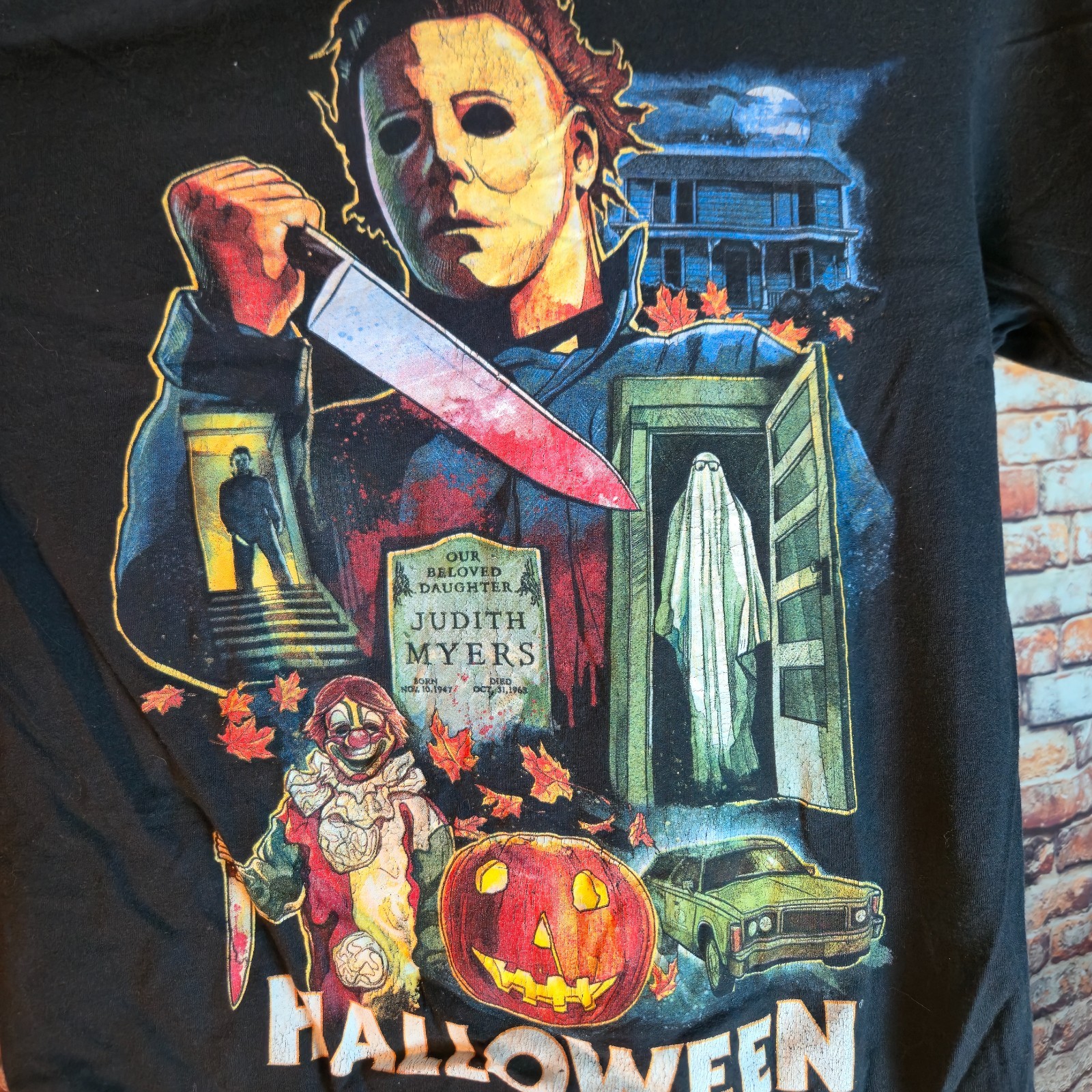 Awesome Halloween horror movie t-shirt featuring a large graphic collage of Michael Myers and iconic imagery from the legendary slasher film.