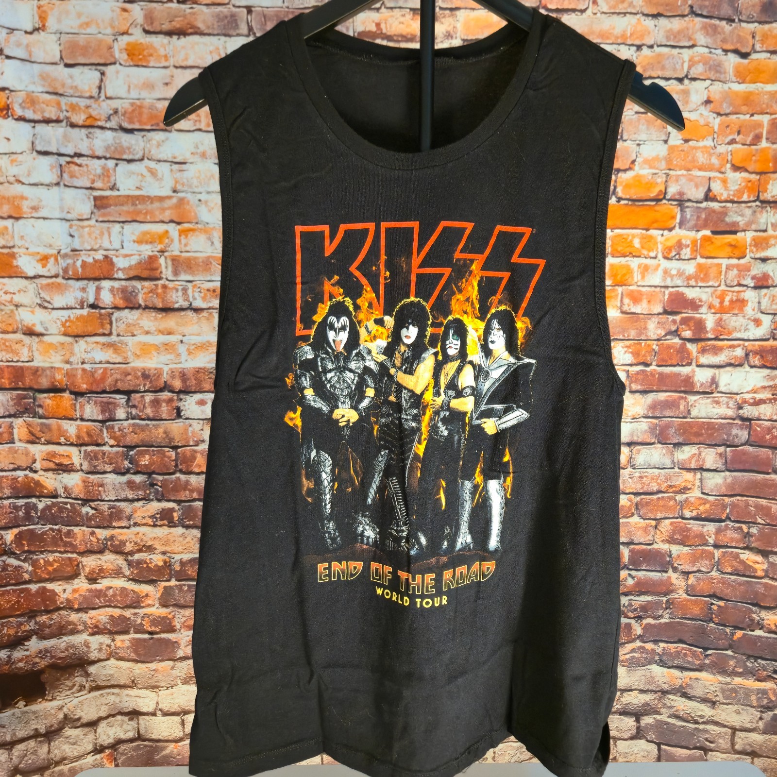 Awesome KISS rock band sleeveless shirt featuring the legendary band lineup and End Of The Road World Tour graphic. Perfect for fans of classic rock and concert merch.