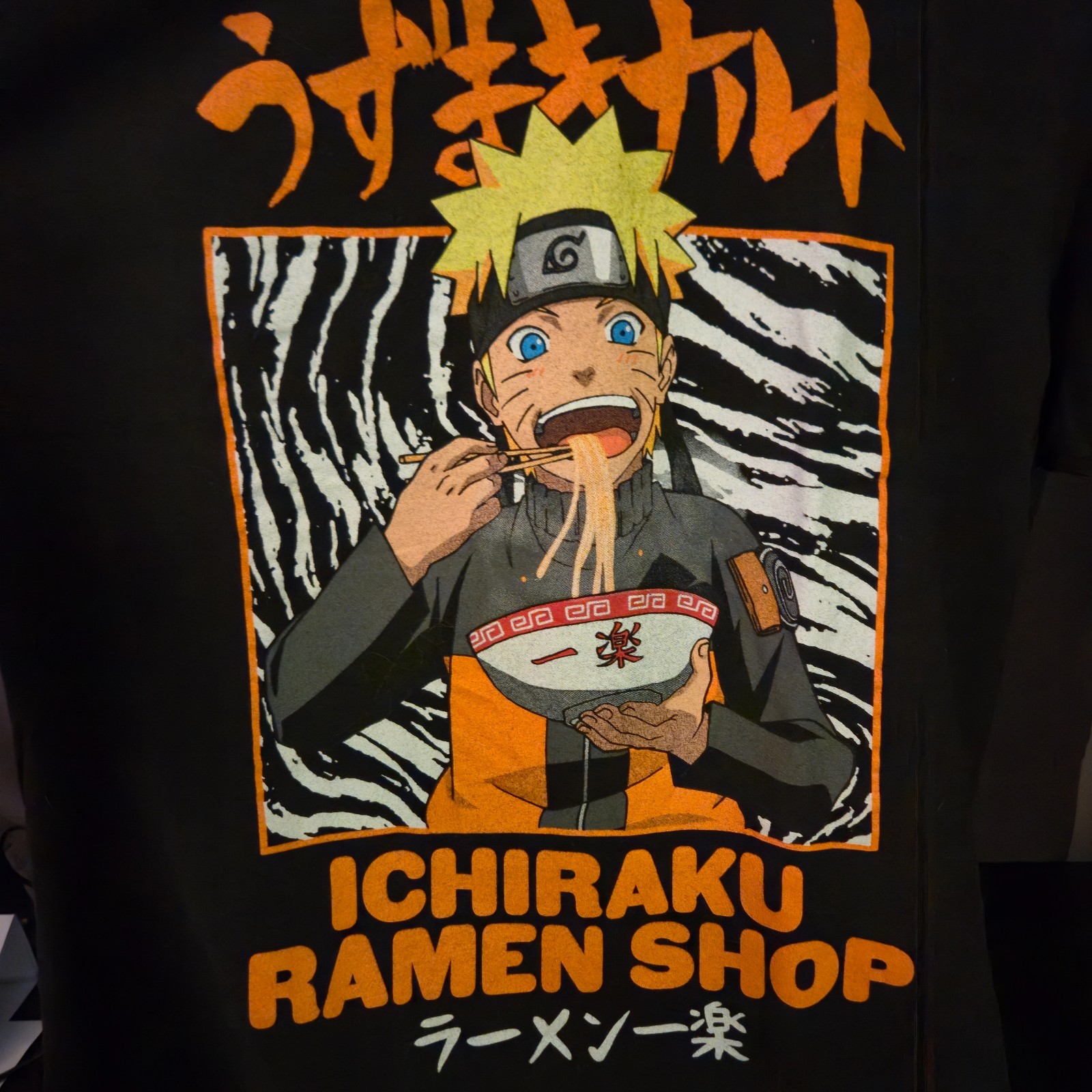 Pre-owned Naruto anime t-shirt featuring Naruto eating ramen at Ichiraku Ramen Shop. Bright colorful graphic print on black tee.