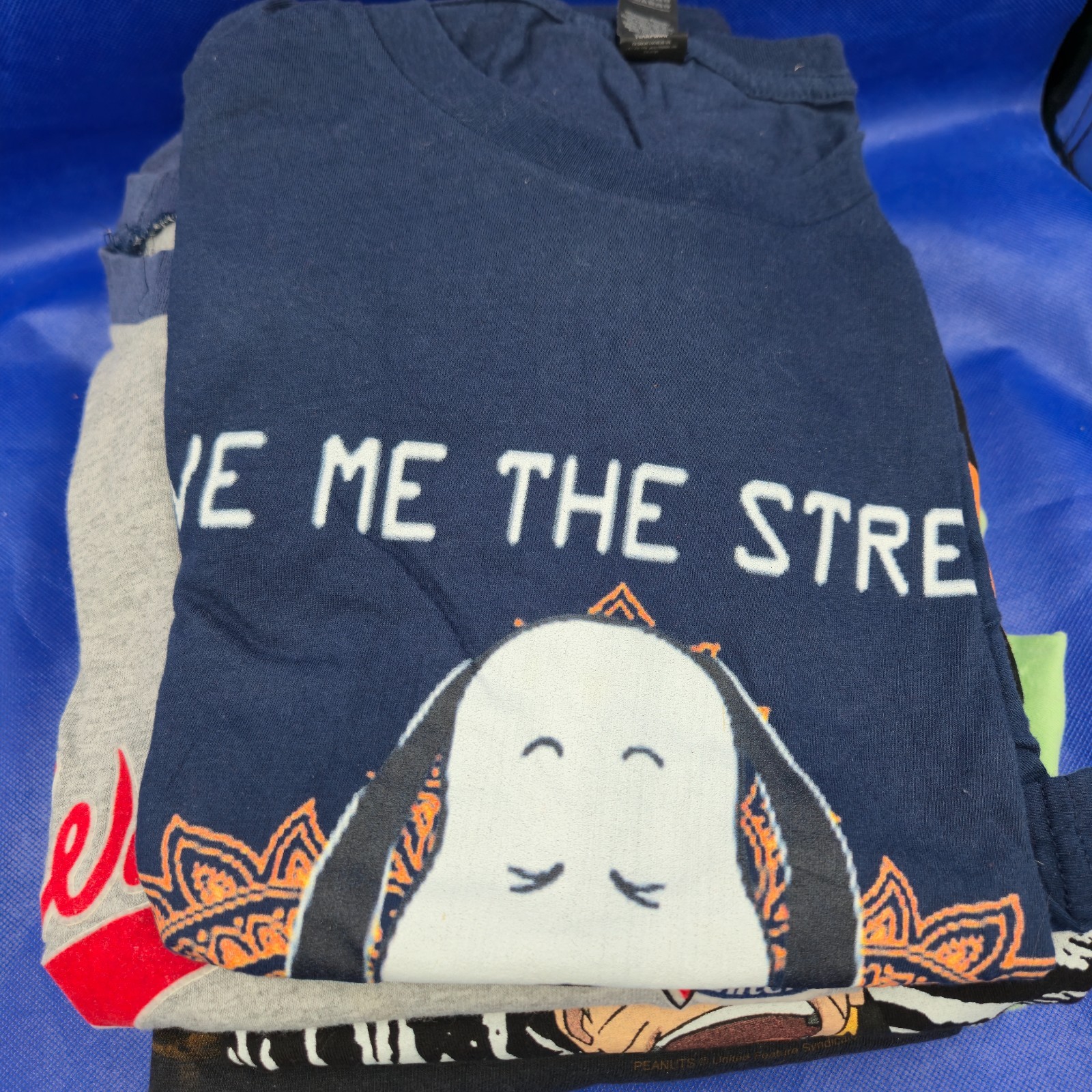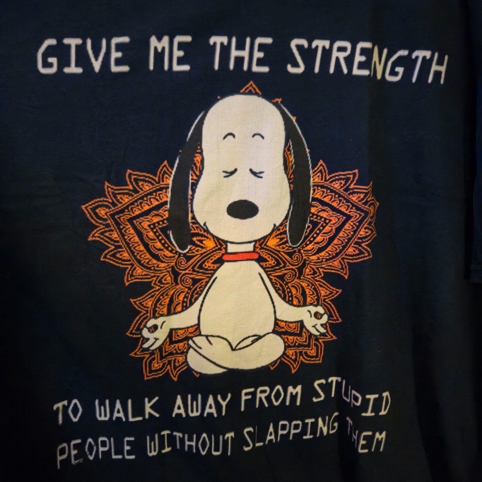 Lightly used Snoopy graphic t-shirt featuring a humorous meditation design with the phrase “Give me the strength to walk away from stupid people without slapping them.”
