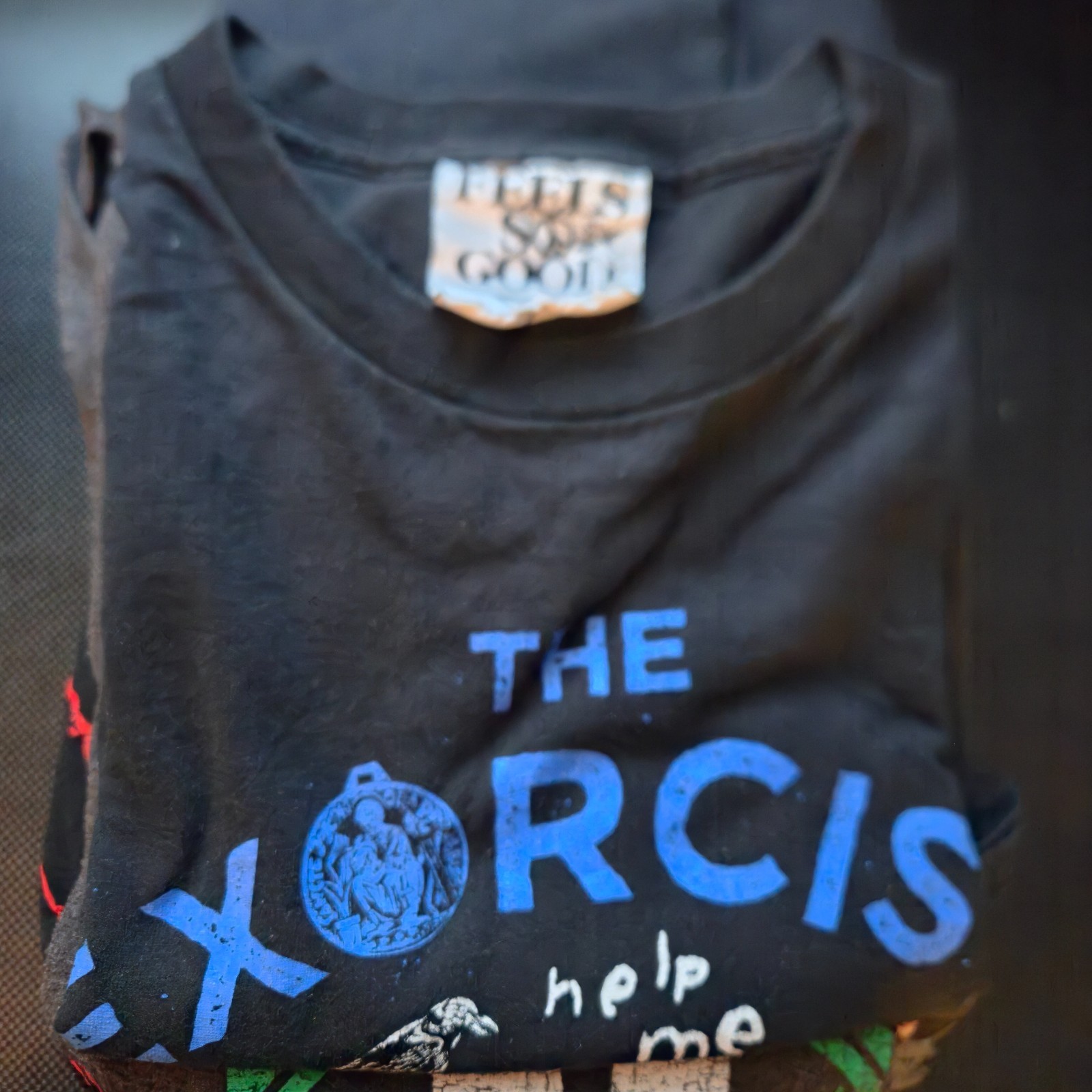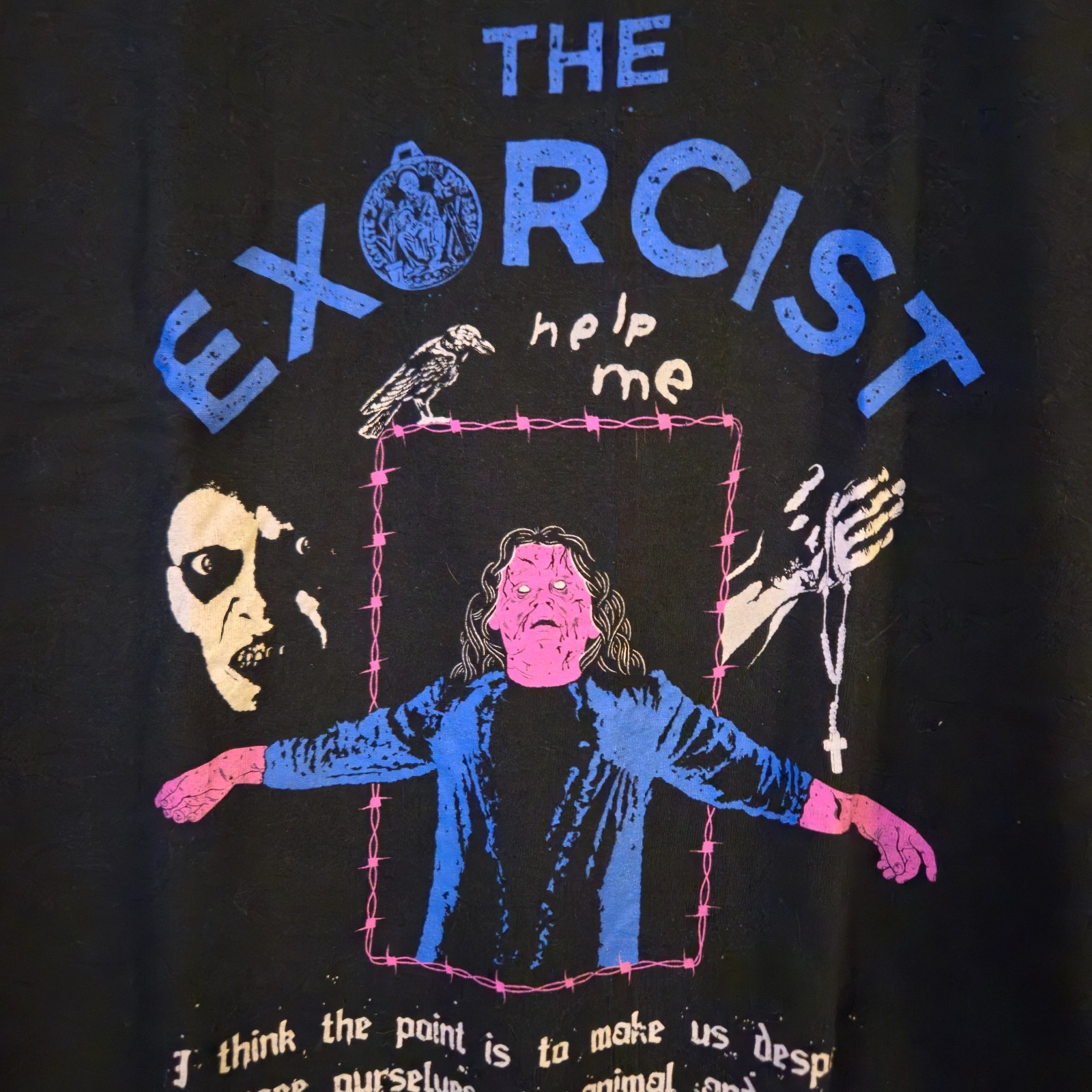Large front graphic print with “THE EXORCIST – help me” design