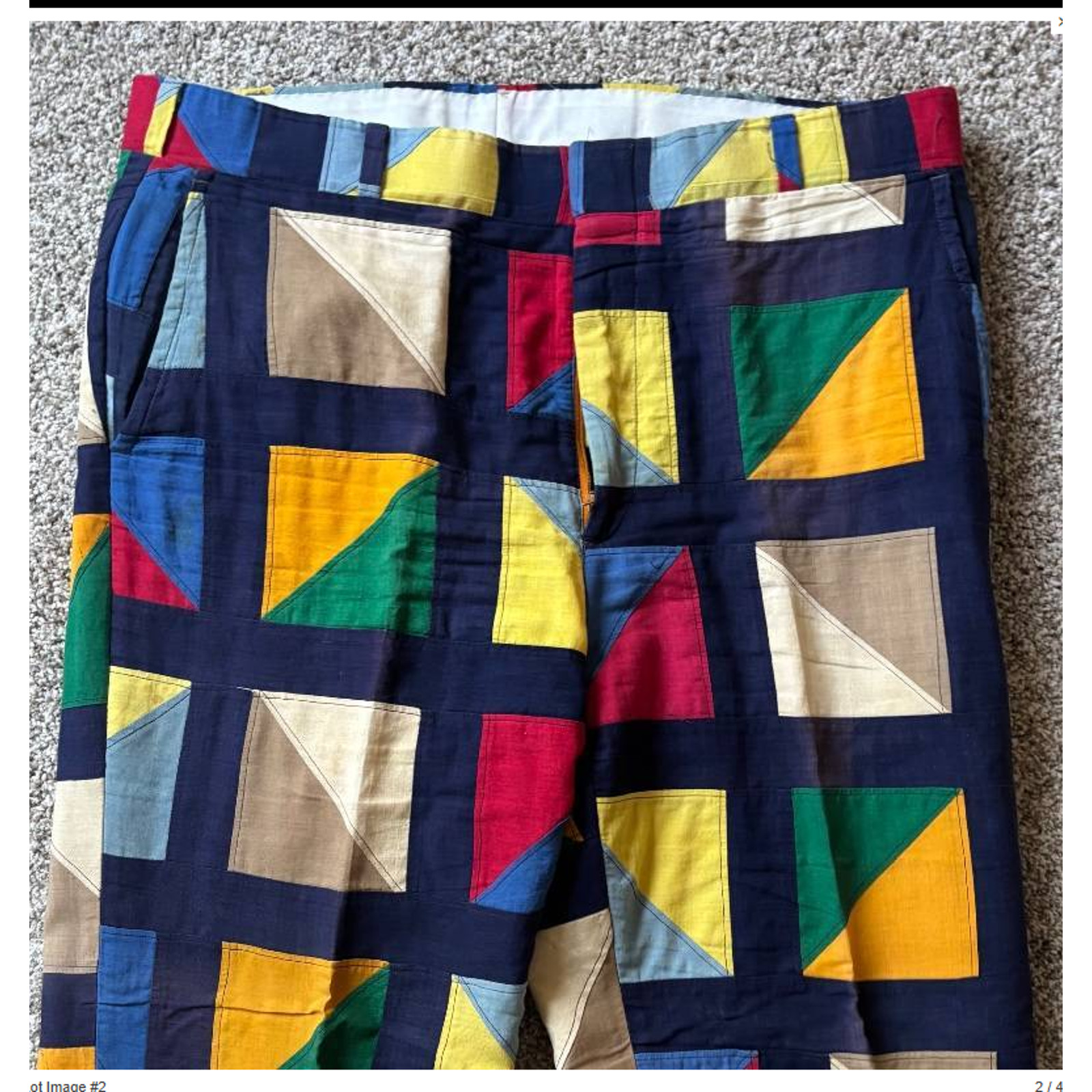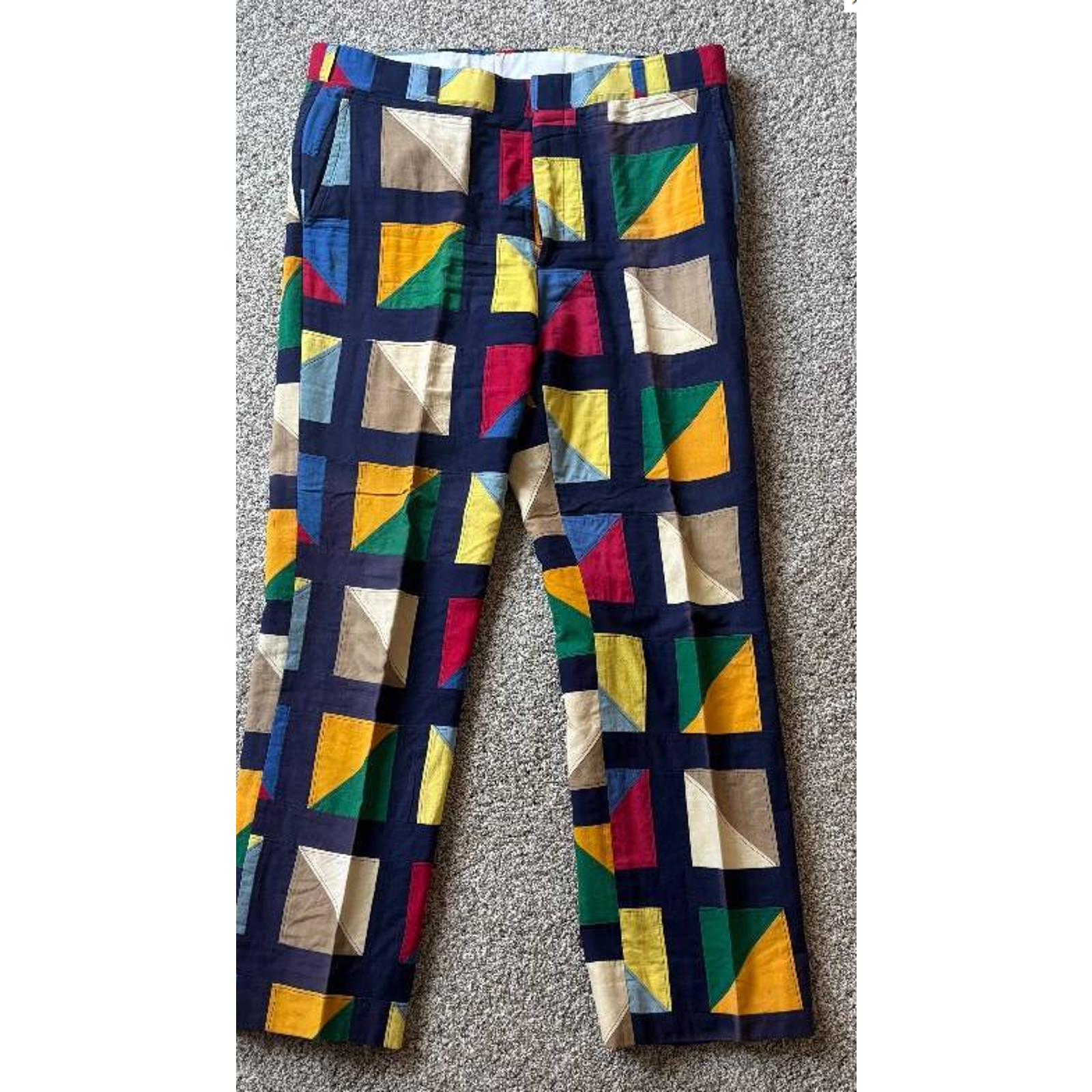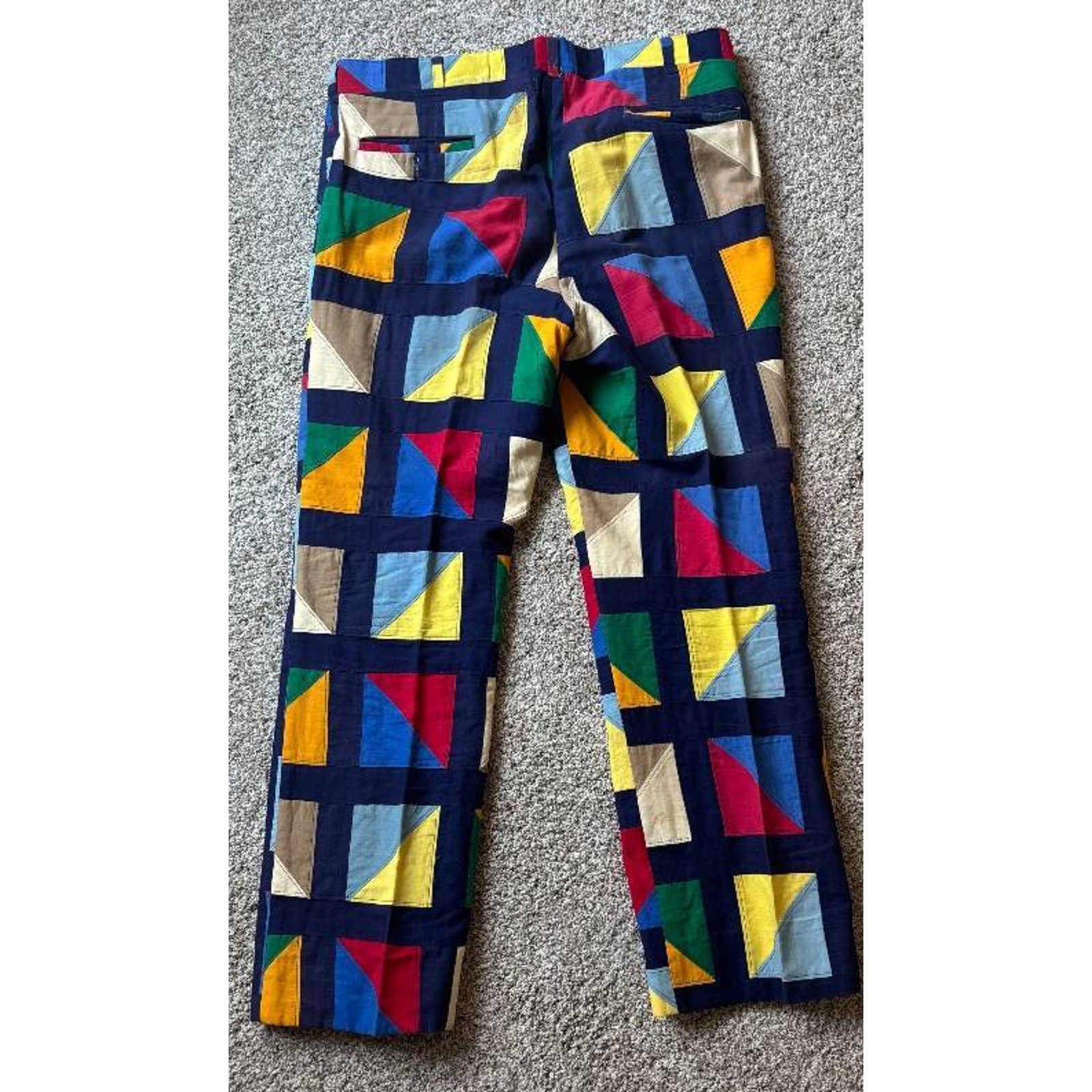 These Vintage Men's Handmade Patchwork Golf Pants with a Geometric Pattern are a unique and stylish addition to any man's wardrobe. Made of cotton in a vibrant multicolor design, these flat front pants feature a regular fit with a straight leg style and slash pockets. Perfect for formal occasions during the spring and summer seasons, these dress pants exude a classic and timeless appeal. With a waist size of 38 inches and a regular size type, these pants are sure to make a statement for any man looking to stand out in their fashion choices. Unique vintage handmade pants featuring a bold geometric patchwork design in various colors including blue, red, yellow, green, and tan. These pants have a flat front and back with a single rear pocket. Waist measures approximately 19 inches. Perfect for anyone seeking an eye-catching retro statement piece or collectible garment.Features:
