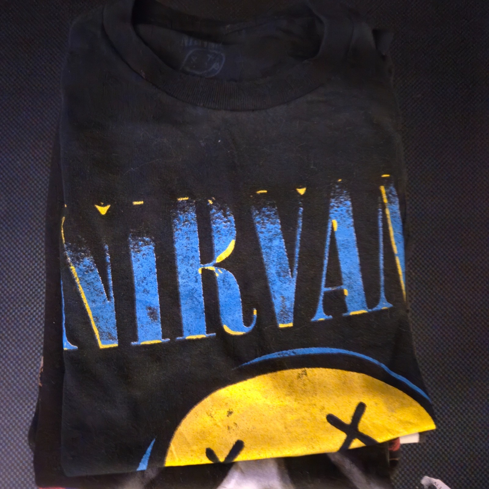 Up for sale is a classic Nirvana smiley face graphic T-shirt in black.